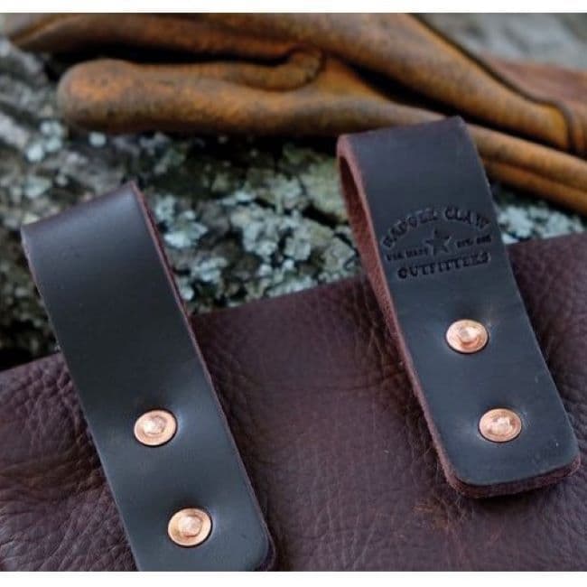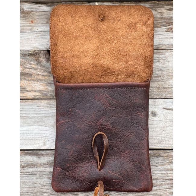 It is made from full grain oil tanned leather and features dual belt loops are cut from bridle leather and attached with peened copper rivets. The top flap is secured with a white tail deer antler toggle and thick leather lace. Due to the handmade nature of this product, sizes may vary slightly.