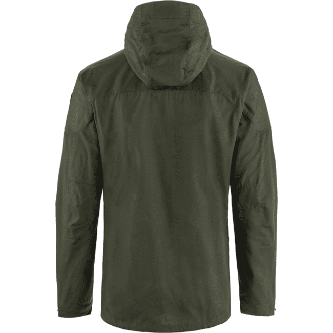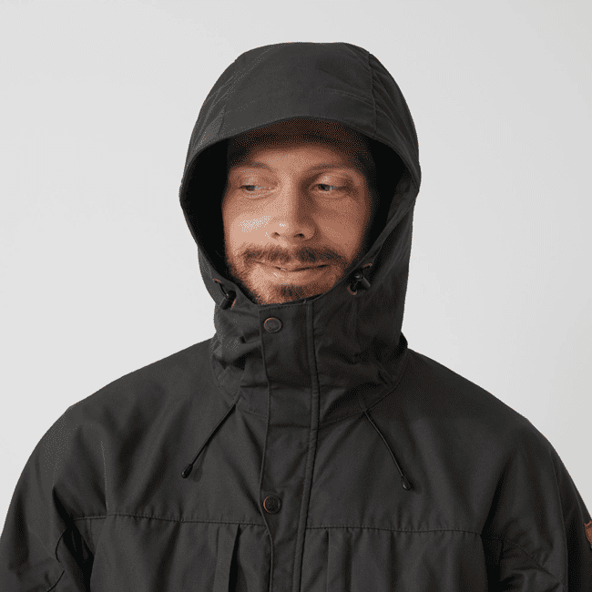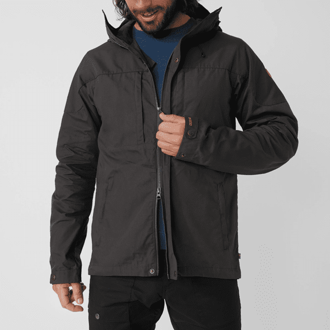 The Skogso is a hip-length outdoors jacket that is slightly longer in the back and has a fixed, adjustable hood. Just as comfortable trekking as it is when biking to and from work. It provides protection from the wind and light rain showers while also offering good ventilation, which means that you will not become as sweaty as you would when wearing a fully waterproof garment.