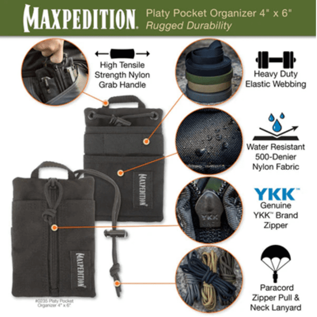Made from rugged 500D water-resistant coated nylon, the organiser boasts a 4” x 6” main compartment secured by a genuine YKK #8 zipper with a paracord pull. Dual frontal pen sleeves, multiple slip pockets, and rear elastic webbing provide storage for flashlights, multitools, tactical pens, and notebooks. A rear 3.5” x 4” slip pocket is perfect for securely stowing thin cellphones.