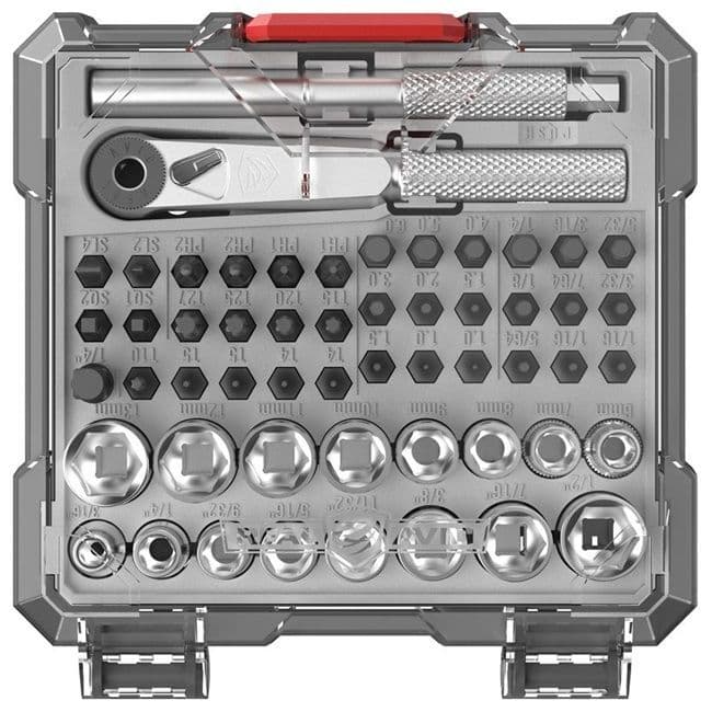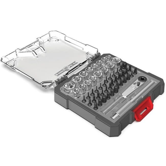 The X3 Driver 52-Piece Set contains an excellent range of popular sizes of bits (35 in total), 1/4" sockets (both metric and imperial), a ratchet driver and a screwdriver bit holder. The ratchet is a 72-tooth mechanism which provides a really smooth operation and precise control. The T-handle configuration allows for increased leverage in high-torque applications