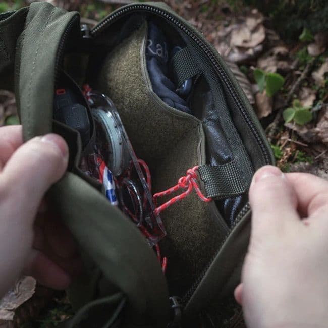 Internally the bag features a number of options for organizing your gear: elastic webbing loops of various size, flat compartments, tie-down loops and a loop surface for attaching hook-backed organizers.