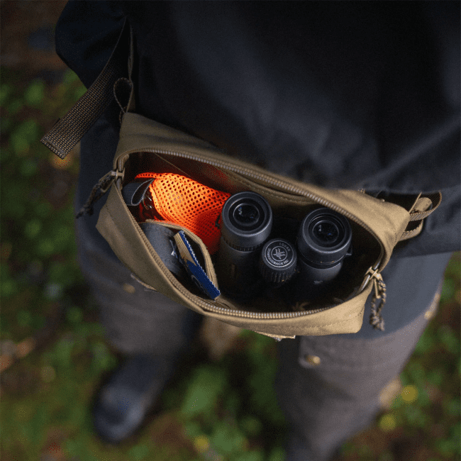 A large, open-ended flat compartment on the back of the pack allows you to stow the waist strap away if needed and can be used as a large belt loop if you want to carry the Suur-Kukkaro on a belt or the hip belt of a backpack.